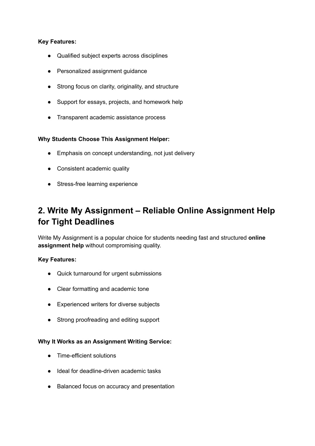 Key Features: ● Qualified subject experts across disciplines ● Personalized assignment guidance ● Strong focus on clarity, originality, and structure ● Support for essays, projects, and homework help ● Transparent academic assistance process Why Students Choose This Assignment Helper: ● Emphasis on concept understanding, not just delivery ● Consistent academic quality ● Stress-free learning experience 2. Write My Assignment – Reliable Online Assignment Help for Tight Deadlines Write My Assignment is a popular choice for students needing fast and structured online assignment help without compromising quality. Key Features: ● Quick turnaround for urgent submissions ● Clear formatting and academic tone ● Experienced writers for diverse subjects ● Strong proofreading and editing support Why It Works as an Assignment Writing Service: ● Time-efficient solutions ● Ideal for deadline-driven academic tasks ● Balanced focus on accuracy and presentation