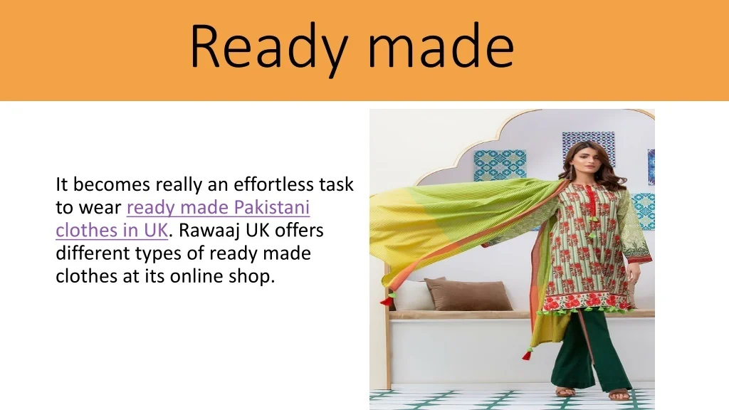 Ready made It becomes really an effortless task to wear ready made Pakistani clothes in UK. Rawaaj UK offers different types of ready made clothes at its online shop.