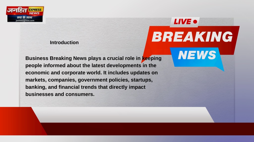 LIVE BREAKING Introduction NEWS Business Breaking News plays a crucial role in keeping people informed about the latest developments in the economic and corporate world. It includes updates on markets, companies, government policies, startups, banking, and financial trends that directly impact businesses and consumers.