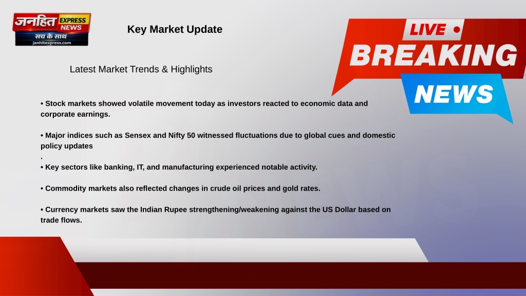 LIVE Key Market Update BREAKING Latest Market Trends & Highlights NEWS • Stock markets showed volatile movement today as investors reacted to economic data and corporate earnings. • Major indices such as Sensex and Nifty 50 witnessed fluctuations due to global cues and domestic policy updates . • Key sectors like banking, IT, and manufacturing experienced notable activity. • Commodity markets also reflected changes in crude oil prices and gold rates. • Currency markets saw the Indian Rupee strengthening/weakening against the US Dollar based on trade flows.