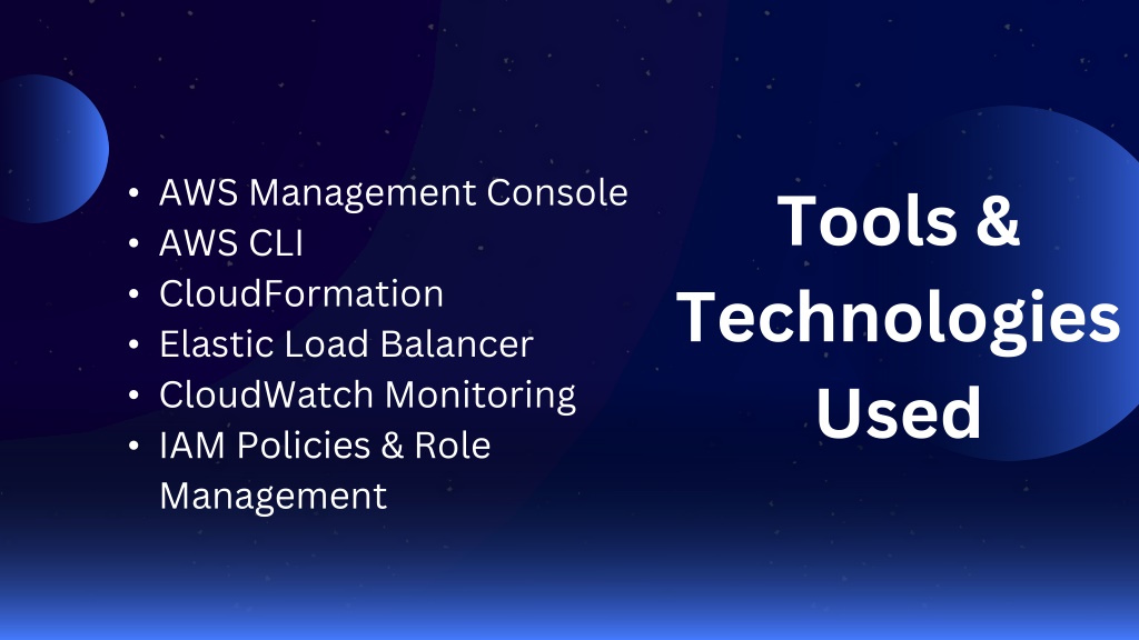 8. AWS Management Console • AWS CLI • CloudFormation • Elastic Load Balancer • CloudWatch Monitoring • IAM Policies & Role Management Tools & Technologies Used
