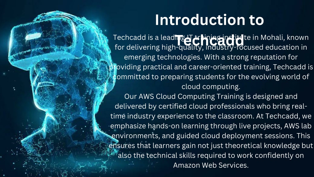 2. Introduction to Techcadd Techcadd is a leading IT training institute in Mohali, known for delivering high-quality, industry-focused education in emerging technologies. With a strong reputation for providing practical and career-oriented training, Techcadd is committed to preparing students for the evolving world of cloud computing. Our AWS Cloud Computing Training is designed and delivered by certified cloud professionals who bring real-time industry experience to the classroom. At Techcadd, we emphasize hands-on learning through live projects, AWS lab environments, and guided cloud deployment sessions. This ensures that learners gain not just theoretical knowledge but also the technical skills required to work confidently on Amazon Web Services.