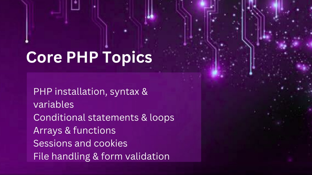 5. Core PHP Topics PHP installation, syntax & variables Conditional statements & loops Arrays & functions Sessions and cookies File handling & form validation