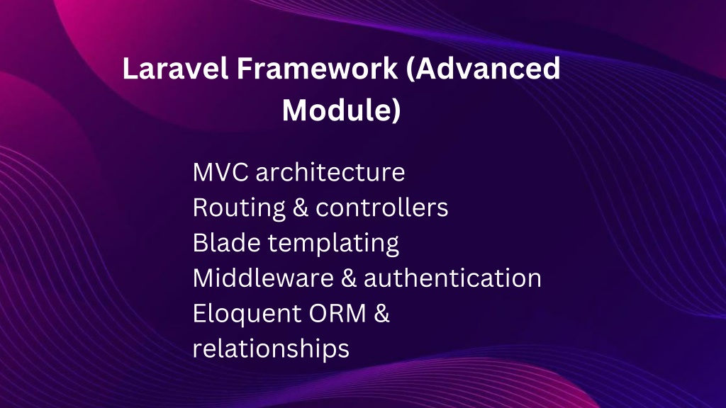 8. Laravel Framework (Advanced Module) MVC architecture Routing & controllers Blade templating Middleware & authentication Eloquent ORM & relationships