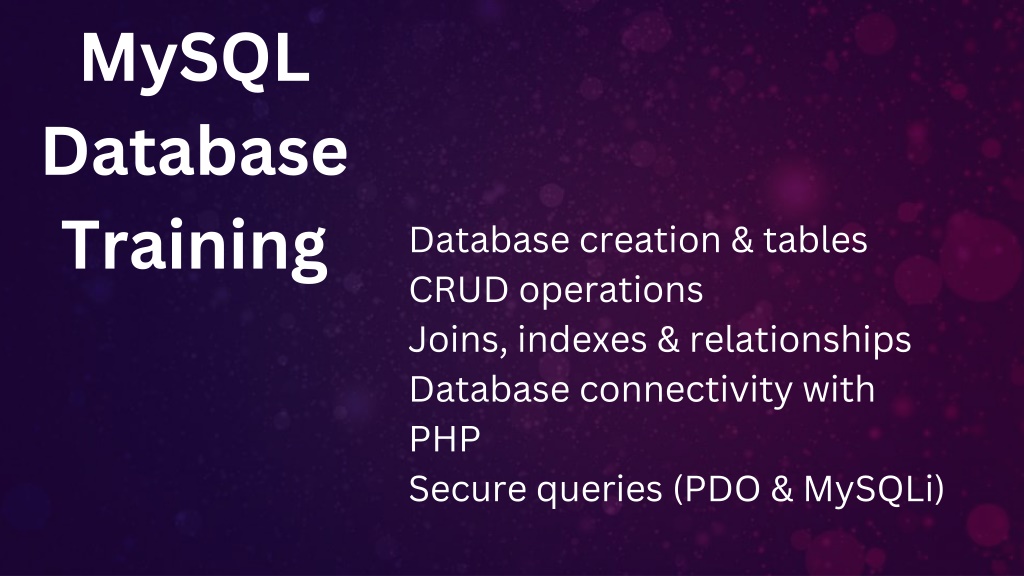 7. MySQL Database Training Database creation & tables CRUD operations Joins, indexes & relationships Database connectivity with PHP Secure queries (PDO & MySQLi)