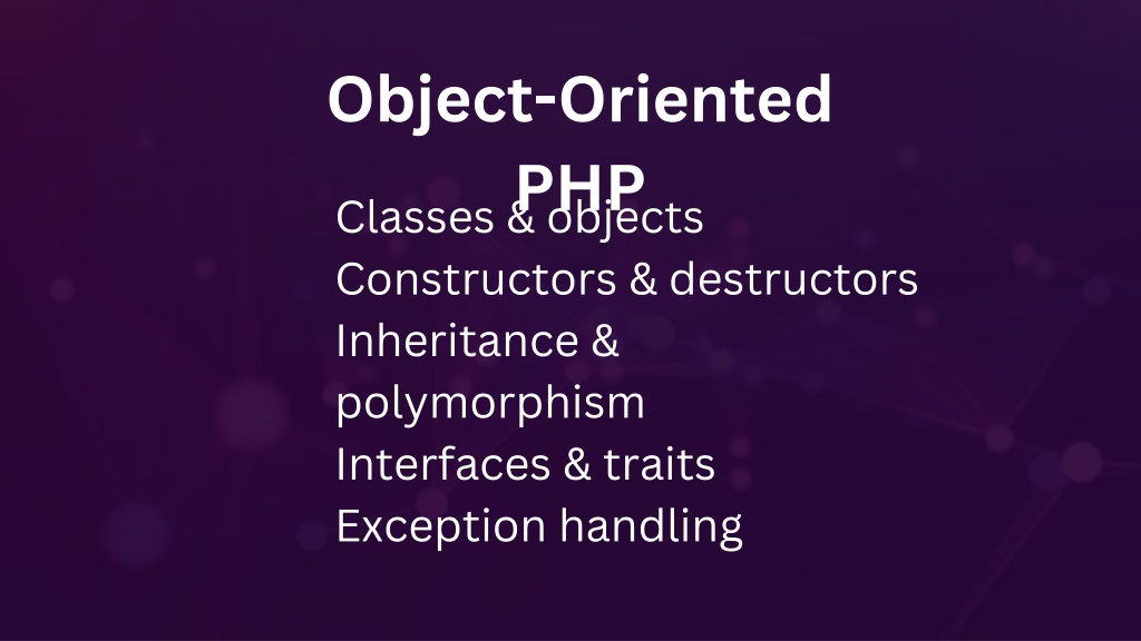 6. Object-Oriented PHP Classes & objects Constructors & destructors Inheritance & polymorphism Interfaces & traits Exception handling
