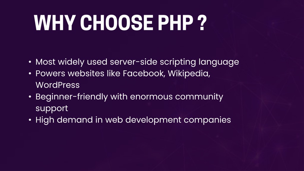 3. WHY CHOOSE PHP ? • Most widely used server-side scripting language • Powers websites like Facebook, Wikipedia, WordPress • Beginner-friendly with enormous community support • High demand in web development companies