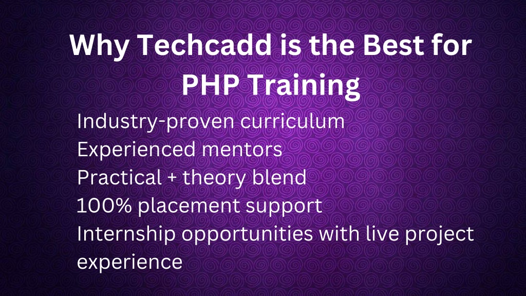 11. Why Techcadd is the Best for PHP Training Industry-proven curriculum Experienced mentors Practical + theory blend 100% placement support Internship opportunities with live project experience
