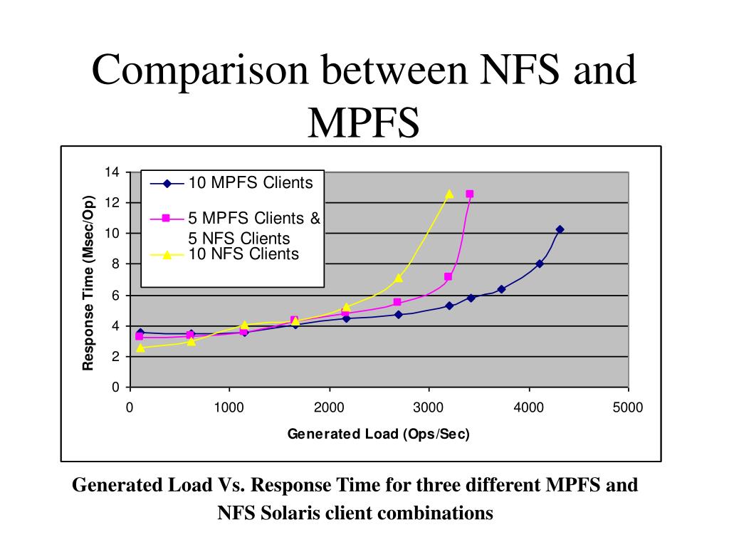 Comparison between NFS and MPFS Generated Load Vs. Response Time for three different MPFS and NFS Solaris client combinations