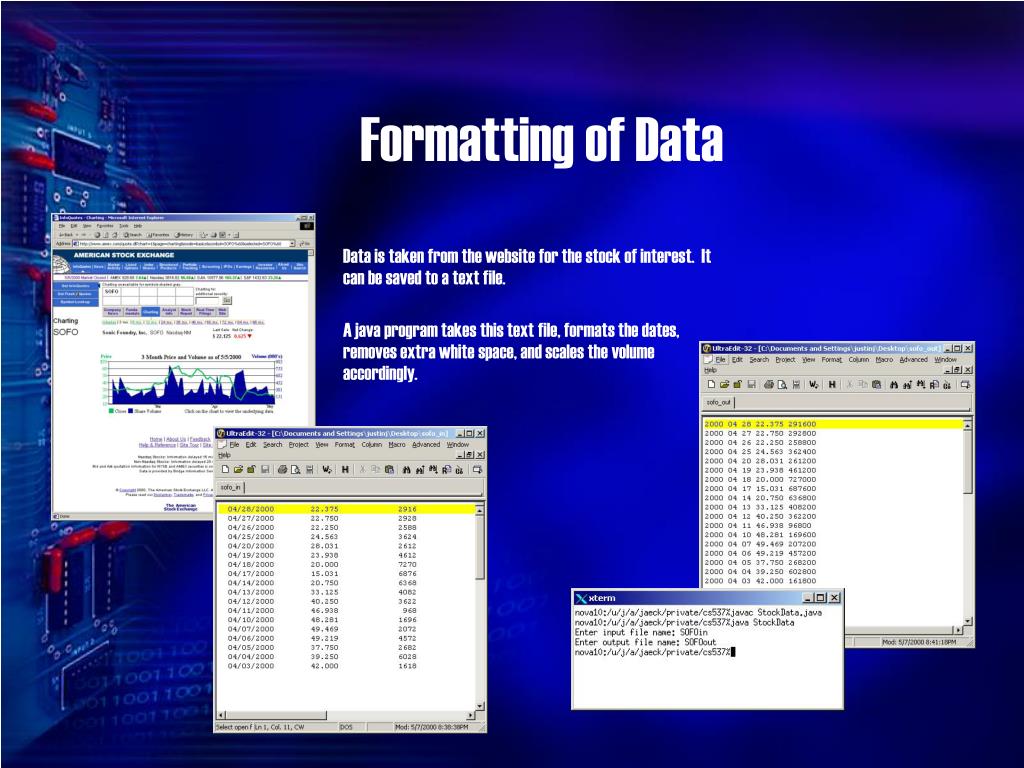 Formatting of Data Data is taken from the website for the stock of interest. It can be saved to a text file. A java program takes this text file, formats the dates, removes extra white space, and scales the volume accordingly.