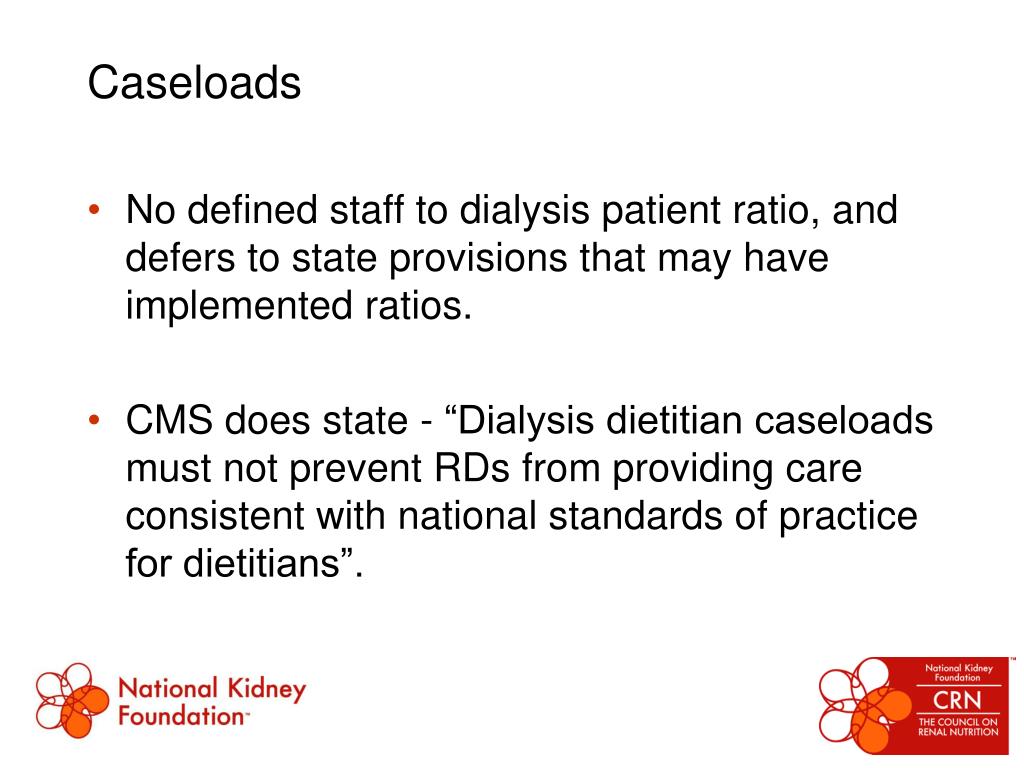 Caseloads • No defined staff to dialysis patient ratio, and defers to state provisions that may have implemented ratios. • CMS does state - “Dialysis dietitian caseloads must not prevent RDs from providing care consistent with national standards of practice for dietitians”.