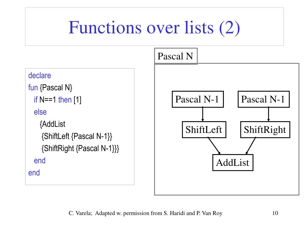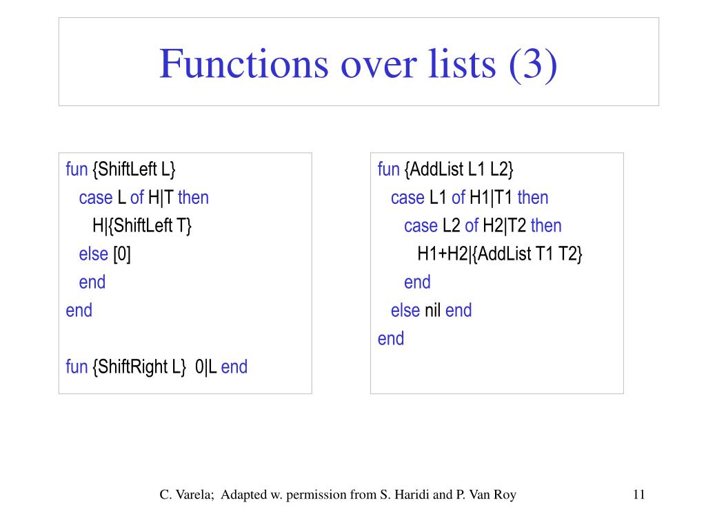 Functions over lists (3) fun {ShiftLeft L} case L of H|T then H|{ShiftLeft T} else [0] end end fun {ShiftRight L} 0|L end fun {AddList L1 L2} case L1 of H1|T1 then case L2 of H2|T2 then H1+H2|{AddList T1 T2} end else nil end end C. Varela; Adapted w. permission from S. Haridi and P. Van Roy