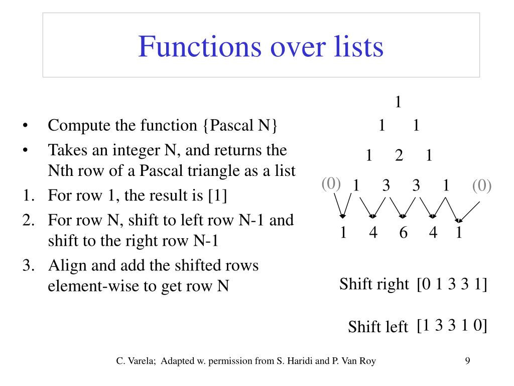 Functions over lists • Compute the function {Pascal N} • Takes an integer N, and returns the Nth row of a Pascal triangle as a list • For row 1, the result is [1] • For row N, shift to left row N-1 and shift to the right row N-1 • Align and add the shifted rows element-wise to get row N 1 1 1 1 2 1 (0) 1 3 3 1 (0) 1 4 6 4 1 Shift right [0 1 3 3 1] [1 3 3 1 0] Shift left C. Varela; Adapted w. permission from S. Haridi and P. Van Roy