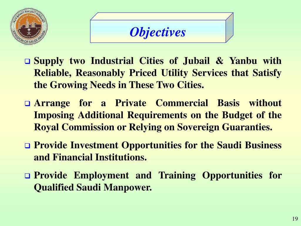 Objectives • Supply two Industrial Cities of Jubail & Yanbu with Reliable, Reasonably Priced Utility Services that Satisfy the Growing Needs in These Two Cities. • Arrange for a Private Commercial Basis without Imposing Additional Requirements on the Budget of the Royal Commission or Relying on Sovereign Guaranties. • Provide Investment Opportunities for the Saudi Business and Financial Institutions. • Provide Employment and Training Opportunities for Qualified Saudi Manpower.