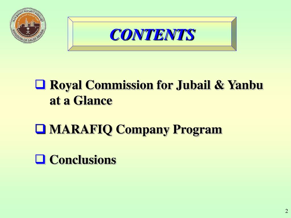 CONTENTS • Royal Commission for Jubail & Yanbu at a Glance • MARAFIQ Company Program • Conclusions
