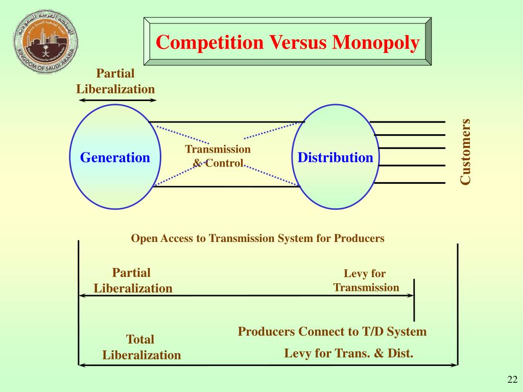 Competition Versus Monopoly Partial Liberalization Generation Distribution Transmission & Control Customers Open Access to Transmission System for Producers Partial Liberalization Levy for Transmission Producers Connect to T/D System Total Liberalization Levy for Trans. & Dist.