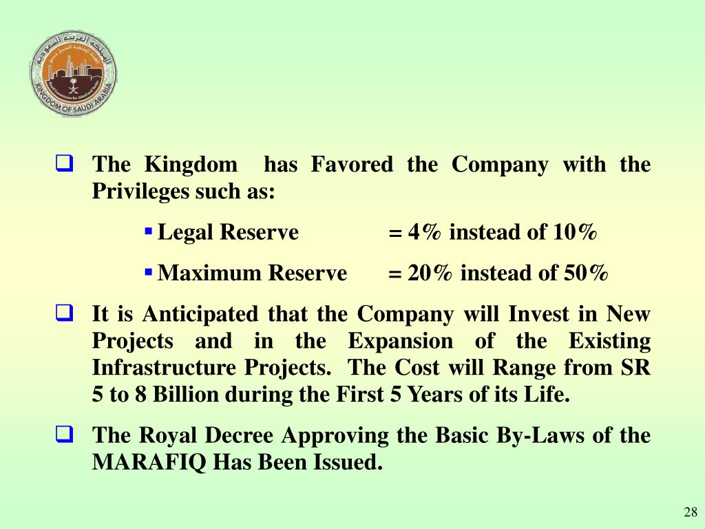 The Kingdom has Favored the Company with the Privileges such as: • Legal Reserve = 4% instead of 10% • Maximum Reserve = 20% instead of 50% • It is Anticipated that the Company will Invest in New Projects and in the Expansion of the Existing Infrastructure Projects. The Cost will Range from SR 5 to 8 Billion during the First 5 Years of its Life. • The Royal Decree Approving the Basic By-Laws of the MARAFIQ Has Been Issued.
