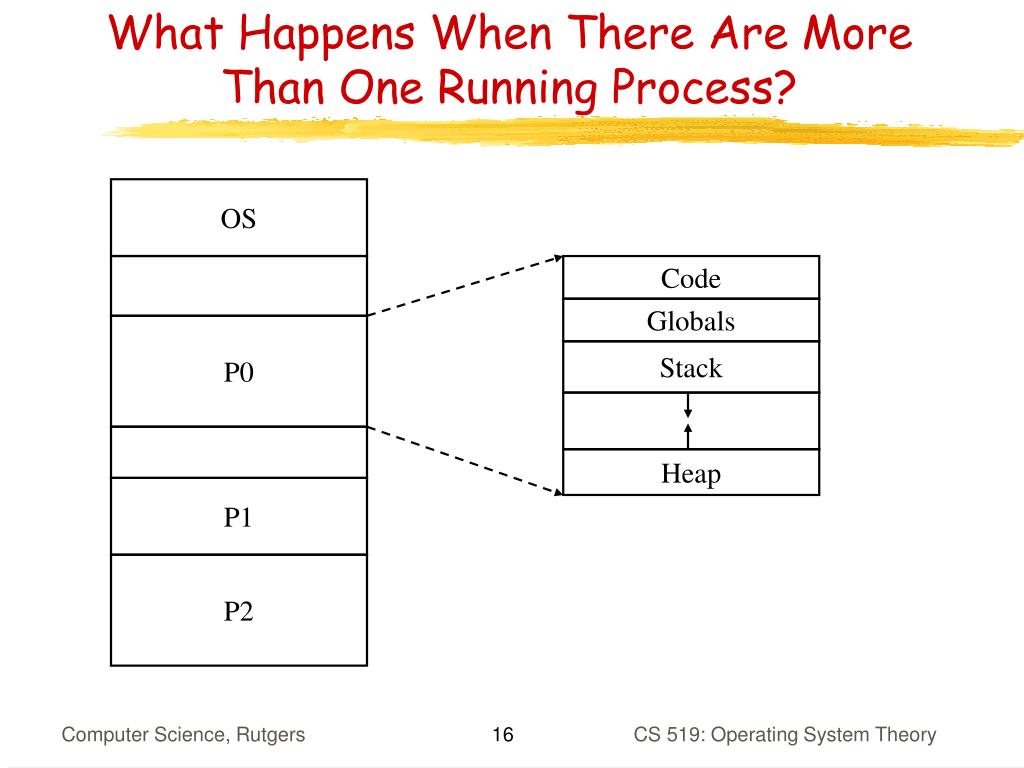 What Happens When There Are More Than One Running Process? OS Code Globals P0 Stack Heap P1 P2 CS 519: Operating System Theory