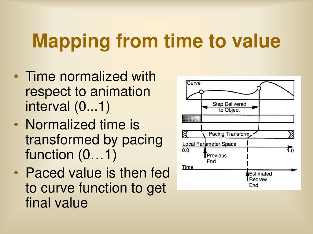 Mapping from time to value • Time normalized with respect to animation interval (0...1) • Normalized time is transformed by pacing function (0…1) • Paced value is then fed to curve function to get final value
