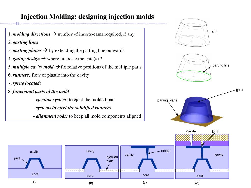 Injection Molding: designing injection molds 1. molding directions number of inserts/cams required, if any 2. parting lines 3. parting planes by extending the parting line outwards 4. gating design where to locate the gate(s) ? 5. multiple cavitymold fix relative positions of the multiple parts 6. runners: flow of plastic into the cavity 7. spruelocated: 8. functional parts of the mold - ejection system: to eject the molded part - systems to eject the solidified runners - alignment rods: to keep all mold components aligned cup parting line gate parting plane