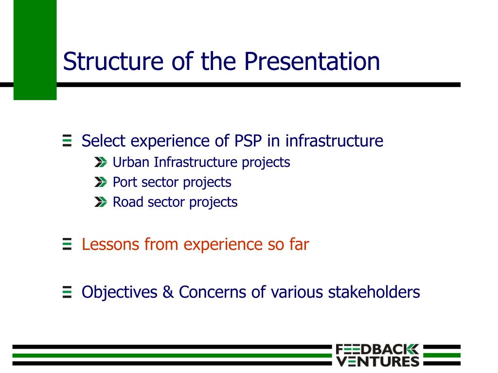 Structure of the Presentation • Select experience of PSP in infrastructure • Urban Infrastructure projects • Port sector projects • Road sector projects • Lessons from experience so far • Objectives & Concerns of various stakeholders