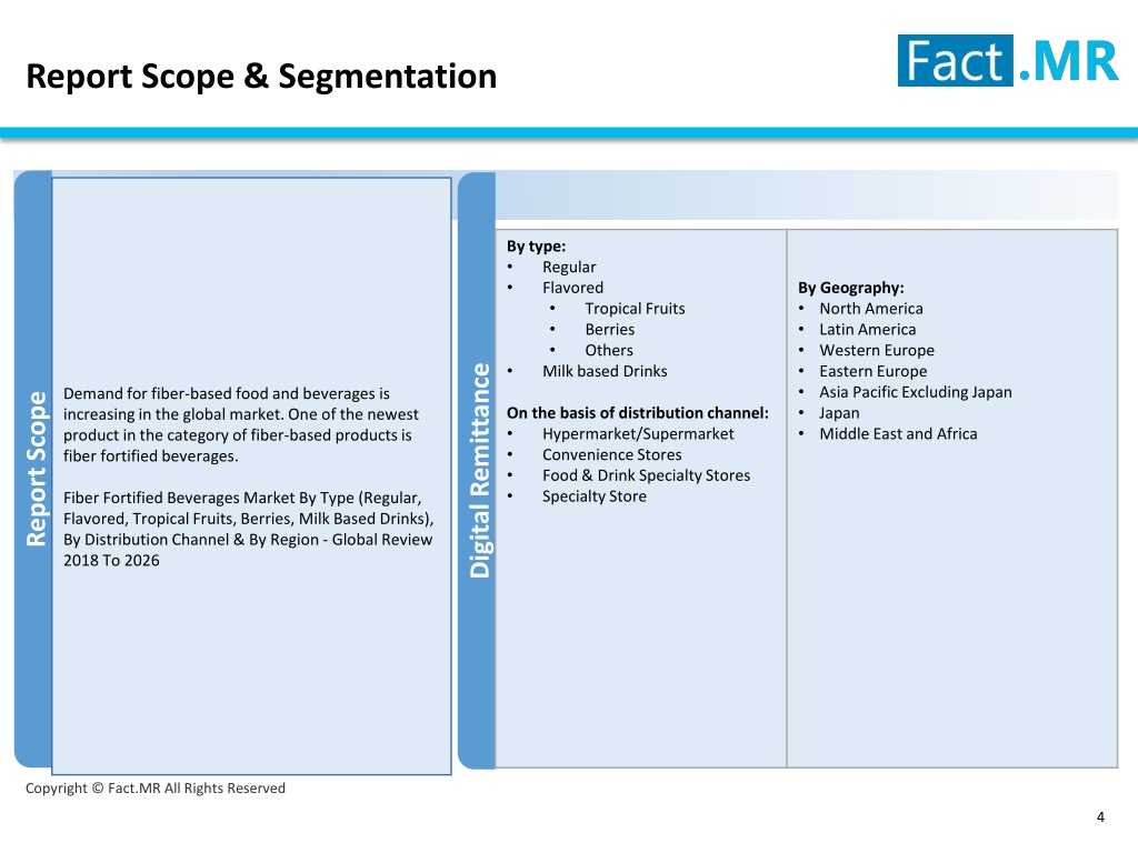 Report Scope & Segmentation Demand for fiber-based food and beverages is increasing in the global market. One of the newest product in the category of fiber-based products is fiber fortified beverages. Fiber Fortified Beverages Market By Type (Regular, Flavored, Tropical Fruits, Berries, Milk Based Drinks), By Distribution Channel & By Region - Global Review 2018 To 2026 Report Scope Digital Remittance Copyright © Fact.MR All Rights Reserved