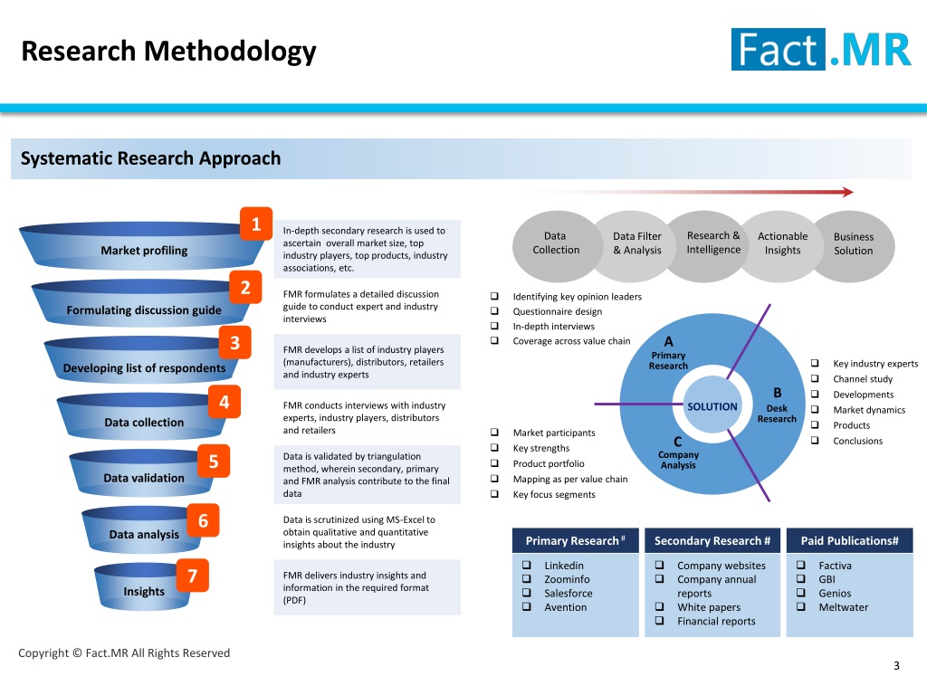 ResearchMethodology Research & Intelligence Data Collection Actionable Insights Data Filter & Analysis Business Solution 1 Market profiling 2 Formulating discussion guide • Identifying key opinion leaders • Questionnaire design • In-depth interviews • Coverage across value chain 3 A Developing list of respondents • Key industry experts • Channel study • Developments • Market dynamics • Products • Conclusions Primary Research 4 SOLUTION Data collection • Market participants • Key strengths • Product portfolio • Mapping as per value chain • Key focus segments B 5 Desk Research Data validation 6 C Data analysis Primary Research # • Secondary Research # • Paid Publications# Company Analysis • Linkedin • Zoominfo • Salesforce • Avention • Company websites • Company annual reports • White papers • Financial reports • Factiva • GBI • Genios • Meltwater 7 Insights Systematic Research Approach Copyright © Fact.MR All Rights Reserved