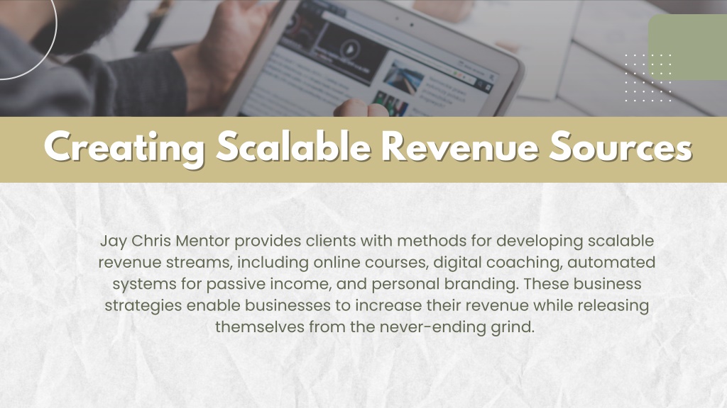 Creating Scalable Revenue Sources Creating Scalable Revenue Sources Jay Chris Mentor provides clients with methods for developing scalable revenue streams, including online courses, digital coaching, automated systems for passive income, and personal branding. These business strategies enable businesses to increase their revenue while releasing themselves from the never-ending grind.