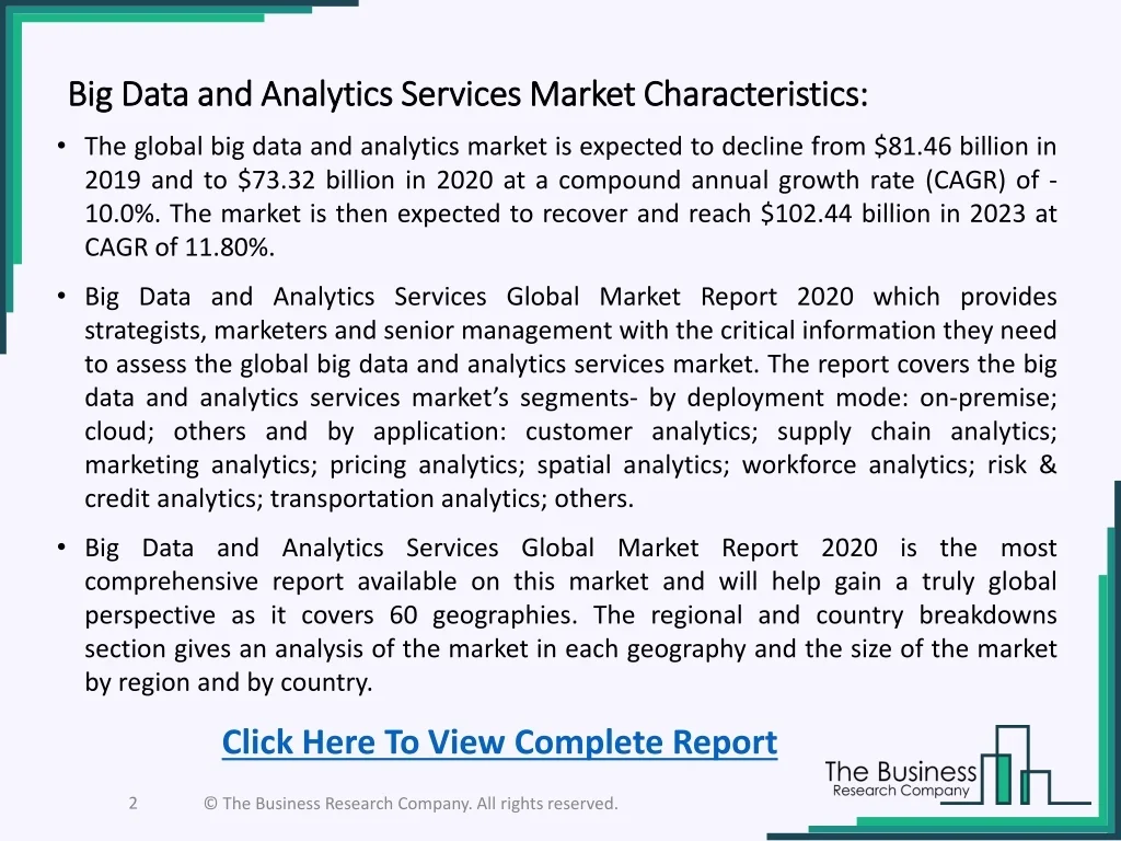Big Big Data and Analytics Data and Analytics Services Market Services Market Characteristics: Characteristics: • The global big data and analytics market is expected to decline from $81.46 billion in 2019 and to $73.32 billion in 2020 at a compound annual growth rate (CAGR) of - 10.0%. The market is then expected to recover and reach $102.44 billion in 2023 at CAGR of 11.80%. • Big Data and Analytics Services Global Market Report 2020 which provides strategists, marketers and senior management with the critical information they need to assess the global big data and analytics services market. The report covers the big data and analytics services market’s segments- by deployment mode: on-premise; cloud; others and by application: customer analytics; supply chain analytics; marketing analytics; pricing analytics; spatial analytics; workforce analytics; risk & credit analytics; transportation analytics; others. • Big Data and Analytics Services Global Market Report 2020 is the most comprehensive report available on this market and will help gain a truly global perspective as it covers 60 geographies. The regional and country breakdowns section gives an analysis of the market in each geography and the size of the market by region and by country. Click Here To View Complete Report 2 © The Business Research Company. All rights reserved.