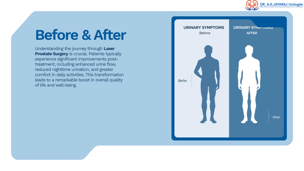 Before & After Understanding the journey through Laser Prostate Surgery is crucial. Patients typically experience significant improvements post- treatment, including enhanced urine flow, reduced nighttime urination, and greater comfort in daily activities. This transformation leads to a remarkable boost in overall quality of life and well-being.