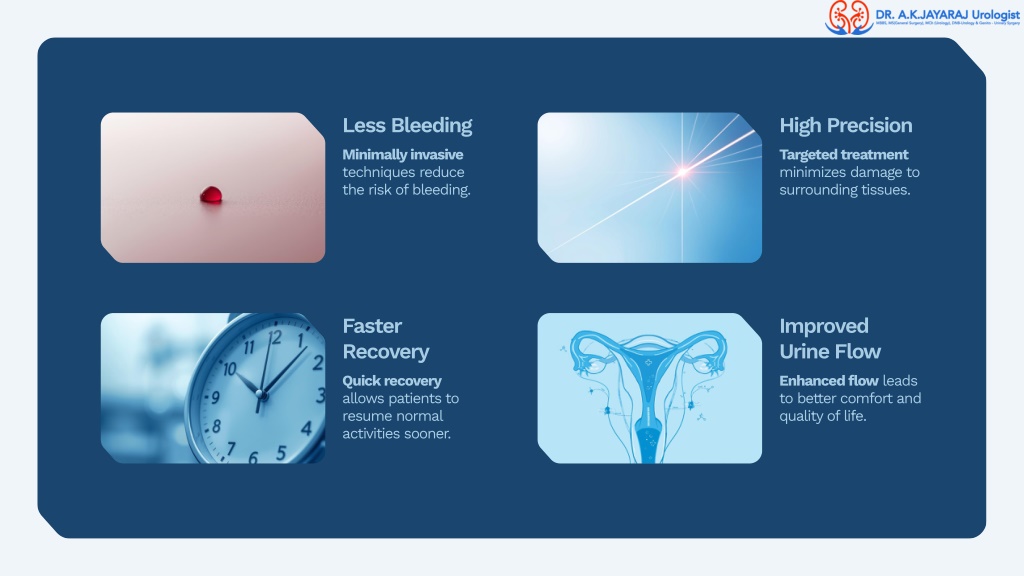 Less Bleeding High Precision Minimally invasive techniques reduce the risk of bleeding. Targeted treatment minimizes damage to surrounding tissues. Faster Recovery Improved Urine Flow Quick recovery allows patients to resume normal activities sooner. Enhanced flow leads to better comfort and quality of life.