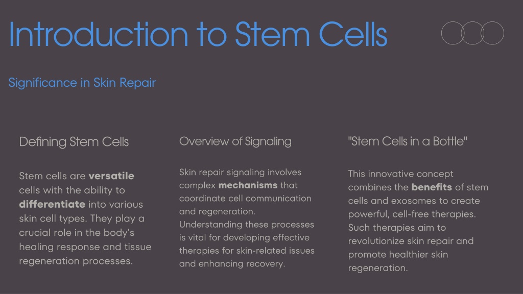 Defining Stem Cells • "Stem Cells in a Bottle" • Overview of Signaling • Introduction to Stem Cells • Skin repair signaling involves complex mechanisms that coordinate cell communication and regeneration. Understanding these processes is vital for developing effective therapies for skin-related issues and enhancing recovery. • This innovative concept combines the benefits of stem cells and exosomes to create powerful, cell-free therapies. Such therapies aim to revolutionize skin repair and promote healthier skin regeneration. • Stem cells are versatile cells with the ability to differentiate into various skin cell types. They play a crucial role in the body's healing response and tissue regeneration processes. • Significance in Skin Repair