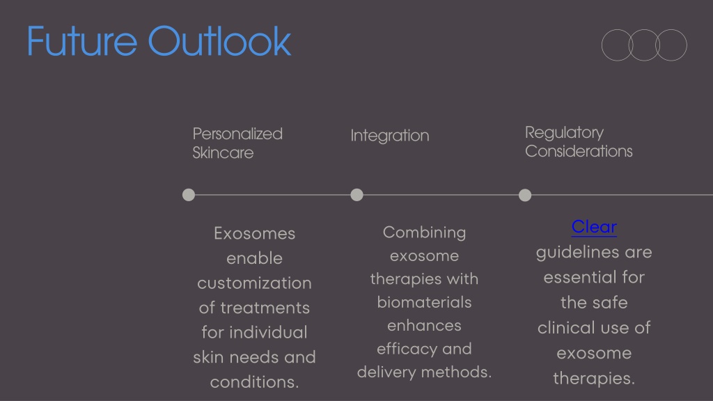 Future Outlook • Regulatory Considerations • Personalized Skincare • Integration • Clear guidelines are essential for the safe clinical use of exosome therapies. • Combining exosome therapies with biomaterials enhances efficacy and delivery methods. • Exosomes enable customization of treatments for individual skin needs and conditions.