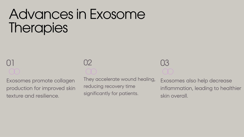 01 • 02 • 03 • Advances in Exosome Therapies • They accelerate wound healing, reducing recovery time significantly for patients. • Exosomes promote collagen production for improved skin texture and resilience. • Exosomes also help decrease inflammation, leading to healthier skin overall.