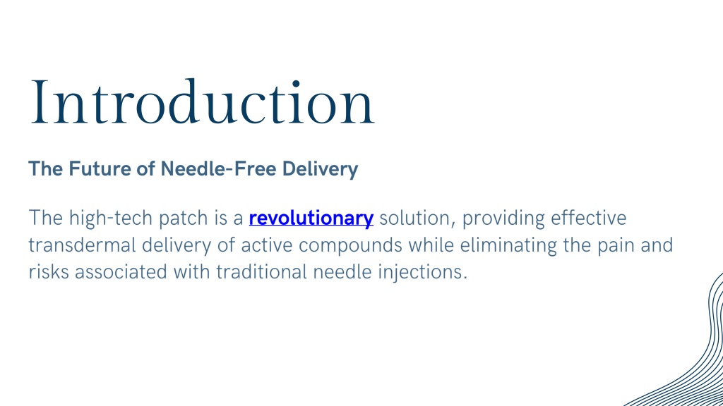 2. Introduction • The Future of Needle-Free Delivery • The high-tech patch is a revolutionary solution, providing effective transdermal delivery of active compounds while eliminating the pain and risks associated with traditional needle injections.
