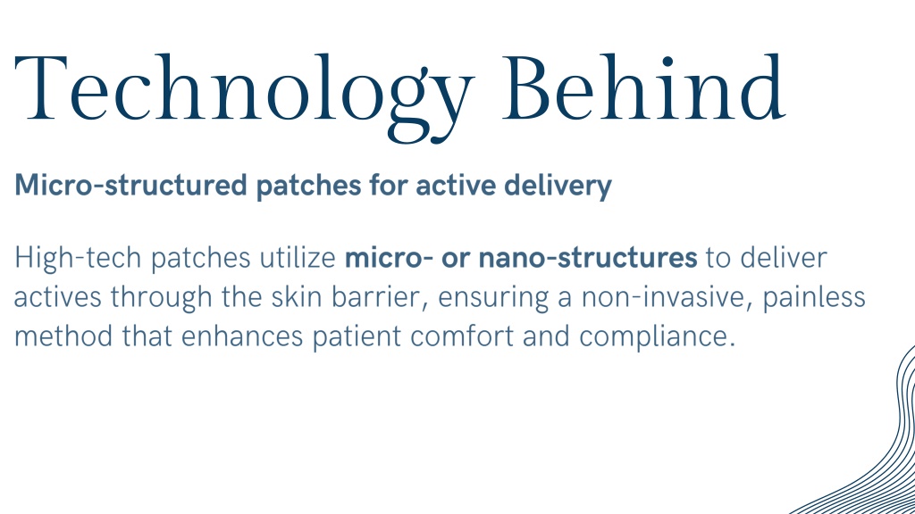 3. Technology Behind • Micro-structured patches for active delivery • High-tech patches utilize micro- or nano-structures to deliver actives through the skin barrier, ensuring a non-invasive, painless method that enhances patient comfort and compliance.