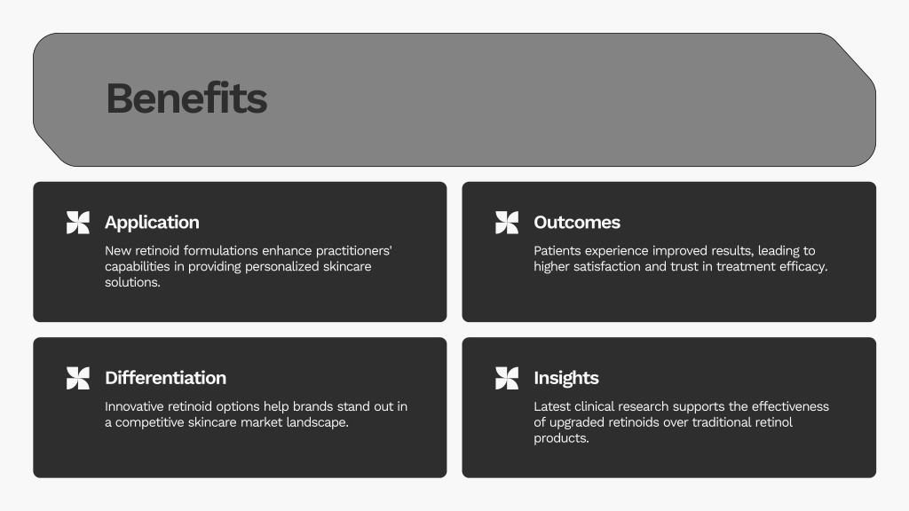 Application • Differentiation • Outcomes • Insights • New retinoid formulations enhance practitioners' capabilities in providing personalized skincare solutions. • Innovative retinoid options help brands stand out in a competitive skincare market landscape. • Patients experience improved results, leading to higher satisfaction and trust in treatment efficacy. • Latest clinical research supports the effectiveness of upgraded retinoids over traditional retinol products. • Benefits