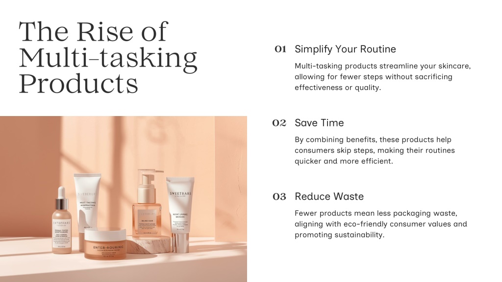 3. Simplify Your Routine • Save Time • Reduce Waste • The Rise of Multi-tasking Products • Multi-tasking products streamline your skincare, allowing for fewer steps without sacrificing effectiveness or quality. • Fewer products mean less packaging waste, aligning with eco-friendly consumer values and promoting sustainability. • By combining benefits, these products help consumers skip steps, making their routines quicker and more efficient. 01 02 03