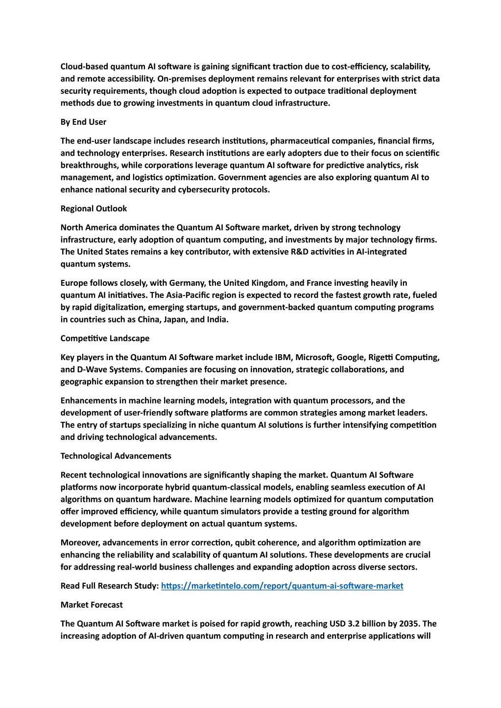 Cloud-based quantum AI software is gaining significant traction due to cost-efficiency, scalability, and remote accessibility. On-premises deployment remains relevant for enterprises with strict data security requirements, though cloud adoption is expected to outpace traditional deployment methods due to growing investments in quantum cloud infrastructure. By End User The end-user landscape includes research institutions, pharmaceutical companies, financial firms, and technology enterprises. Research institutions are early adopters due to their focus on scientific breakthroughs, while corporations leverage quantum AI software for predictive analytics, risk management, and logistics optimization. Government agencies are also exploring quantum AI to enhance national security and cybersecurity protocols. Regional Outlook North America dominates the Quantum AI Software market, driven by strong technology infrastructure, early adoption of quantum computing, and investments by major technology firms. The United States remains a key contributor, with extensive R&D activities in AI-integrated quantum systems. Europe follows closely, with Germany, the United Kingdom, and France investing heavily in quantum AI initiatives. The Asia-Pacific region is expected to record the fastest growth rate, fueled by rapid digitalization, emerging startups, and government-backed quantum computing programs in countries such as China, Japan, and India. Competitive Landscape Key players in the Quantum AI Software market include IBM, Microsoft, Google, Rigetti Computing, and D-Wave Systems. Companies are focusing on innovation, strategic collaborations, and geographic expansion to strengthen their market presence. Enhancements in machine learning models, integration with quantum processors, and the development of user-friendly software platforms are common strategies among market leaders. The entry of startups specializing in niche quantum AI solutions is further intensifying competition and driving technological advancements. Technological Advancements Recent technological innovations are significantly shaping the market. Quantum AI Software platforms now incorporate hybrid quantum-classical models, enabling seamless execution of AI algorithms on quantum hardware. Machine learning models optimized for quantum computation offer improved efficiency, while quantum simulators provide a testing ground for algorithm development before deployment on actual quantum systems. Moreover, advancements in error correction, qubit coherence, and algorithm optimization are enhancing the reliability and scalability of quantum AI solutions. These developments are crucial for addressing real-world business challenges and expanding adoption across diverse sectors. Read Full Research Study: https://marketintelo.com/report/quantum-ai-software-market Market Forecast The Quantum AI Software market is poised for rapid growth, reaching USD 3.2 billion by 2035. The increasing adoption of AI-driven quantum computing in research and enterprise applications will