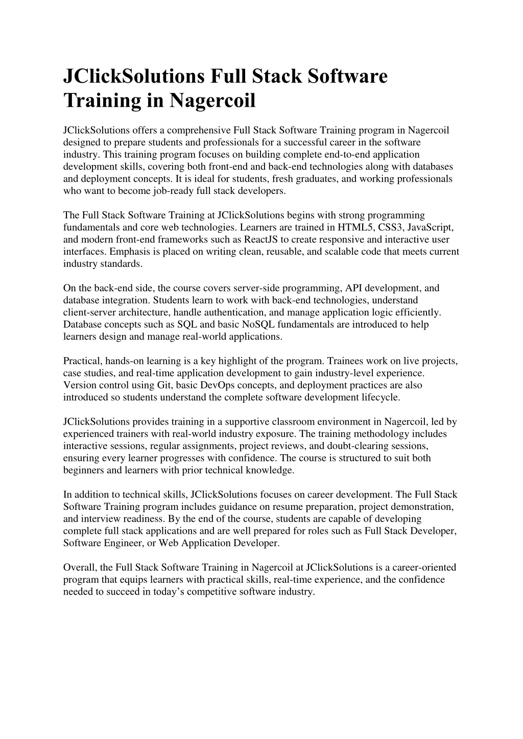1. JClickSolutions Full Stack Software Training in Nagercoil JClickSolutions offers a comprehensive Full Stack Software Training program in Nagercoil designed to prepare students and professionals for a successful career in the software industry. This training program focuses on building complete end-to-end application development skills, covering both front-end and back-end technologies along with databases and deployment concepts. It is ideal for students, fresh graduates, and working professionals who want to become job-ready full stack developers. The Full Stack Software Training at JClickSolutions begins with strong programming fundamentals and core web technologies. Learners are trained in HTML5, CSS3, JavaScript, and modern front-end frameworks such as ReactJS to create responsive and interactive user interfaces. Emphasis is placed on writing clean, reusable, and scalable code that meets current industry standards. On the back-end side, the course covers server-side programming, API development, and database integration. Students learn to work with back-end technologies, understand client-server architecture, handle authentication, and manage application logic efficiently. Database concepts such as SQL and basic NoSQL fundamentals are introduced to help learners design and manage real-world applications. Practical, hands-on learning is a key highlight of the program. Trainees work on live projects, case studies, and real-time application development to gain industry-level experience. Version control using Git, basic DevOps concepts, and deployment practices are also introduced so students understand the complete software development lifecycle. JClickSolutions provides training in a supportive classroom environment in Nagercoil, led by experienced trainers with real-world industry exposure. The training methodology includes interactive sessions, regular assignments, project reviews, and doubt-clearing sessions, ensuring every learner progresses with confidence. The course is structured to suit both beginners and learners with prior technical knowledge. In addition to technical skills, JClickSolutions focuses on career development. The Full Stack Software Training program includes guidance on resume preparation, project demonstration, and interview readiness. By the end of the course, students are capable of developing complete full stack applications and are well prepared for roles such as Full Stack Developer, Software Engineer, or Web Application Developer. Overall, the Full Stack Software Training in Nagercoil at JClickSolutions is a career-oriented program that equips learners with practical skills, real-time experience, and the confidence needed to succeed in today’s competitive software industry.