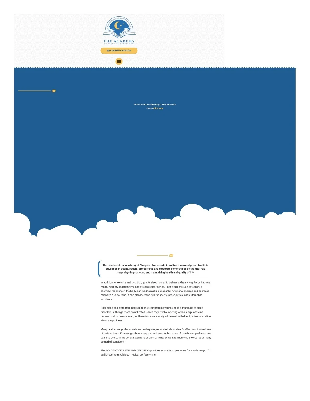 COURSE CATALOG Interested in participating in sleep research Please click here! The mission of the Academy of Sleep and Wellness is to cultivate knowledge and facilitate education in public, patient, professional and corporate communities on the vital role sleep plays in promoting and maintaining health and quality of life. In addition to exercise and nutrition, quality sleep is vital to wellness. Great sleep helps improve mood, memory, reaction time and athletic performance. Poor sleep, through established chemical reactions in the body, can lead to making unhealthy nutritional choices and decrease motivation to exercise. It can also increase risk for heart disease, stroke and automobile accidents. Poor sleep can stem from bad habits that compromise your sleep to a multitude of sleep disorders. Although more complicated issues may involve working with a sleep medicine professional to resolve, many of these issues are easily addressed with direct patient education about the problem. Many health care professionals are inadequately educated about sleep’s affects on the wellness of their patients. Knowledge about sleep and wellness in the hands of health care professionals can improve both the general wellness of their patients as well as improving the course of many comorbid conditions. The ACADEMY OF SLEEP AND WELLNESS provides educational programs for a wide range of audiences from public to medical professionals.