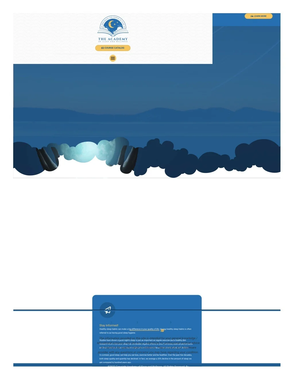 LEARN MORE COURSE CATALOG Privacy Policy Terms & Conditions Sitemap Stay Informed! Healthy sleep habits can make a big difference in your quality of life. Having healthy sleep habits is often referred to as having good sleep hygiene. The information provided on this site is intended for your general knowledge / Studies have shown a good night’s sleep is just as important as regular exercise and a healthy diet. educational purposes only and is not a substitute for professional medical advice or treatment for speci?c medical conditions. Please consult your healthcare provider with any questions or concerns you may have regarding your condition. Research shows that poor sleep has immediate negative effects on your hormones, exercise performance and brain function, it can also cause weight gain and increase disease risk in both adults and children. In contrast, good sleep can help you eat less, exercise better and be healthier. Over the past few decades, both sleep quality and quantity has declined. In fact, we average a 20% decline in the amount of sleep we get compared to hundred years ago. ©2022 Copyright Academy of Sleep and Wellness All Rights Reserved By