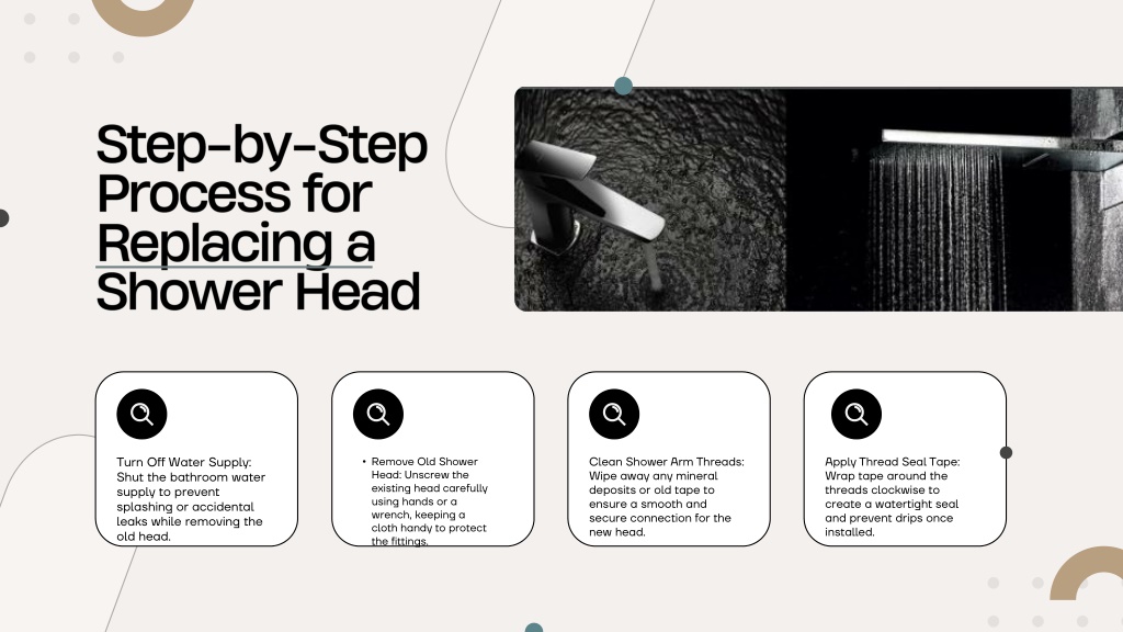 Step-by-Step Process for Replacing a Shower Head Turn Off Water Supply: Shut the bathroom water supply to prevent splashing or accidental leaks while removing the old head. • Remove Old Shower Head: Unscrew the existing head carefully using hands or a wrench, keeping a cloth handy to protect the fittings. Clean Shower Arm Threads: Wipe away any mineral deposits or old tape to ensure a smooth and secure connection for the new head. Apply Thread Seal Tape: Wrap tape around the threads clockwise to create a watertight seal and prevent drips once installed.