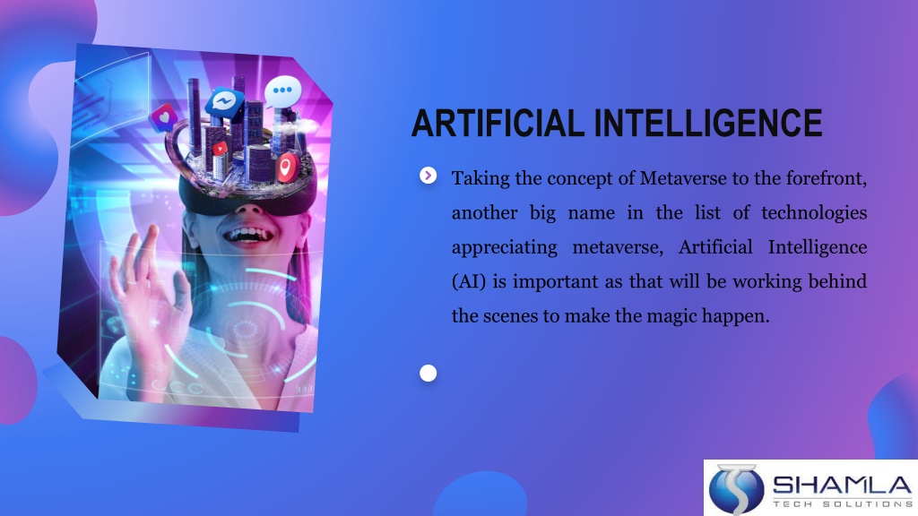 ARTIFICIAL INTELLIGENCE Taking the concept of Metaverse to the forefront, another big name in the list of technologies appreciating metaverse, Artificial Intelligence (AI) is important as that will be working behind the scenes to make the magic happen.