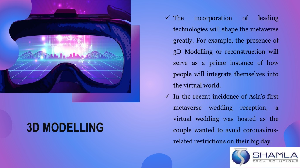✓ The incorporation of leading technologies will shape the metaverse greatly. For example, the presence of 3D Modelling or reconstruction will serve as a prime instance of how people will integrate themselves into the virtual world. ✓ In the recent incidence of Asia’s first metaverse wedding reception, a virtual wedding was hosted as the 3D MODELLING couple wanted to avoid coronavirus- related restrictions on their big day.