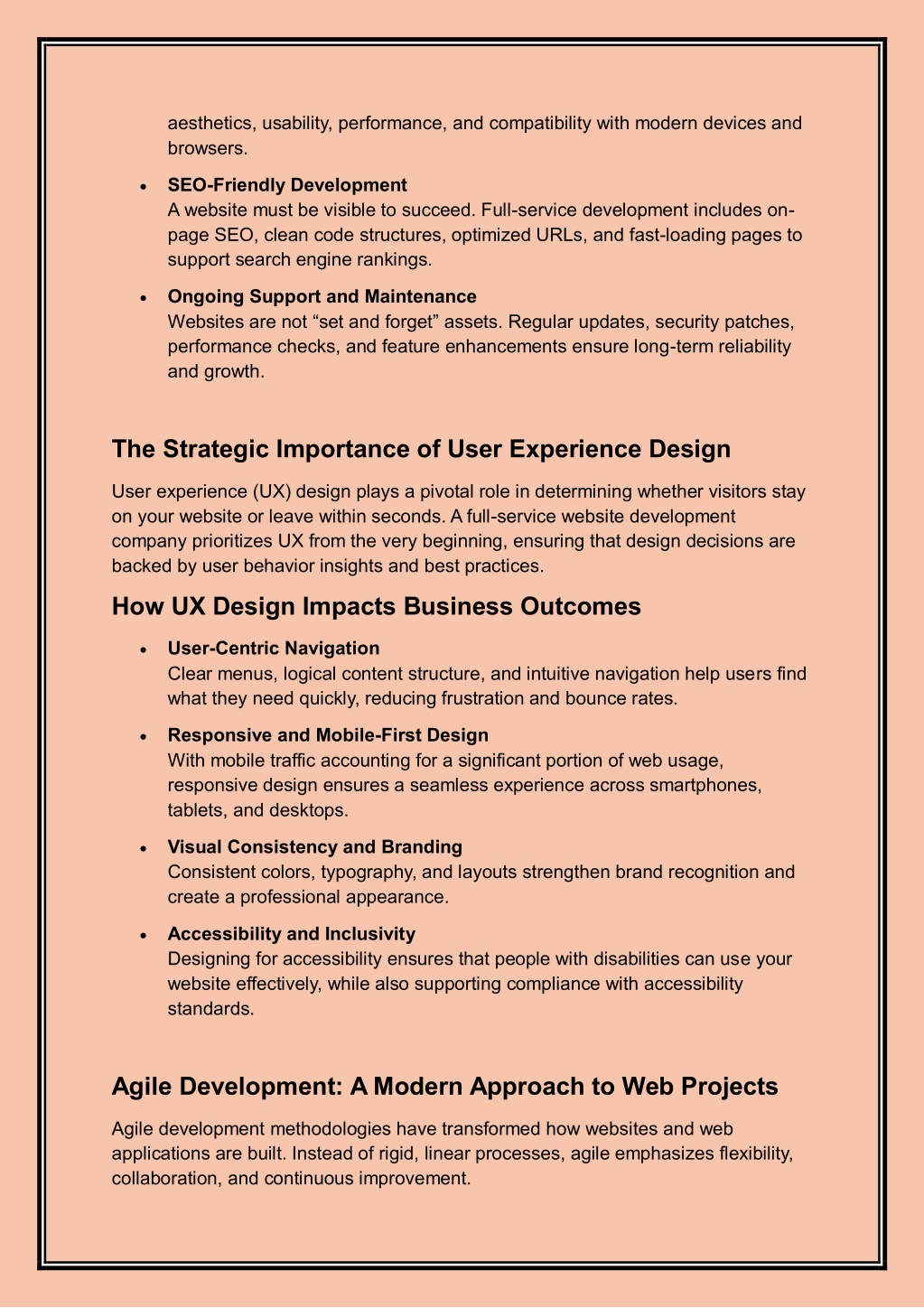 aesthetics, usability, performance, and compatibility with modern devices and browsers. SEO-Friendly Development A website must be visible to succeed. Full-service development includes on- page SEO, clean code structures, optimized URLs, and fast-loading pages to support search engine rankings. Ongoing Support and Maintenance Websites are not “set and forget” assets. Regular updates, security patches, performance checks, and feature enhancements ensure long-term reliability and growth. The Strategic Importance of User Experience Design User experience (UX) design plays a pivotal role in determining whether visitors stay on your website or leave within seconds. A full-service website development company prioritizes UX from the very beginning, ensuring that design decisions are backed by user behavior insights and best practices. How UX Design Impacts Business Outcomes User-Centric Navigation Clear menus, logical content structure, and intuitive navigation help users find what they need quickly, reducing frustration and bounce rates. Responsive and Mobile-First Design With mobile traffic accounting for a significant portion of web usage, responsive design ensures a seamless experience across smartphones, tablets, and desktops. Visual Consistency and Branding Consistent colors, typography, and layouts strengthen brand recognition and create a professional appearance. Accessibility and Inclusivity Designing for accessibility ensures that people with disabilities can use your website effectively, while also supporting compliance with accessibility standards. Agile Development: A Modern Approach to Web Projects Agile development methodologies have transformed how websites and web applications are built. Instead of rigid, linear processes, agile emphasizes flexibility, collaboration, and continuous improvement.