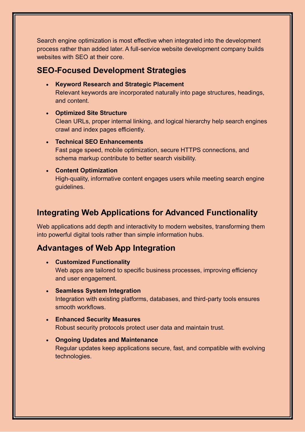 Search engine optimization is most effective when integrated into the development process rather than added later. A full-service website development company builds websites with SEO at their core. SEO-Focused Development Strategies Keyword Research and Strategic Placement Relevant keywords are incorporated naturally into page structures, headings, and content. Optimized Site Structure Clean URLs, proper internal linking, and logical hierarchy help search engines crawl and index pages efficiently. Technical SEO Enhancements Fast page speed, mobile optimization, secure HTTPS connections, and schema markup contribute to better search visibility. Content Optimization High-quality, informative content engages users while meeting search engine guidelines. Integrating Web Applications for Advanced Functionality Web applications add depth and interactivity to modern websites, transforming them into powerful digital tools rather than simple information hubs. Advantages of Web App Integration Customized Functionality Web apps are tailored to specific business processes, improving efficiency and user engagement. Seamless System Integration Integration with existing platforms, databases, and third-party tools ensures smooth workflows. Enhanced Security Measures Robust security protocols protect user data and maintain trust. Ongoing Updates and Maintenance Regular updates keep applications secure, fast, and compatible with evolving technologies.