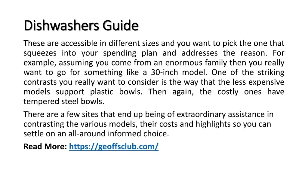Dishwashers Guide These are accessible in different sizes and you want to pick the one that squeezes into your spending plan and addresses the reason. For example, assuming you come from an enormous family then you really want to go for something like a 30-inch model. One of the striking contrasts you really want to consider is the way that the less expensive models support plastic bowls. Then again, the costly ones have tempered steel bowls. There are a few sites that end up being of extraordinary assistance in contrasting the various models, their costs and highlights so you can settle on an all-around informed choice. Read More: https://geoffsclub.com/