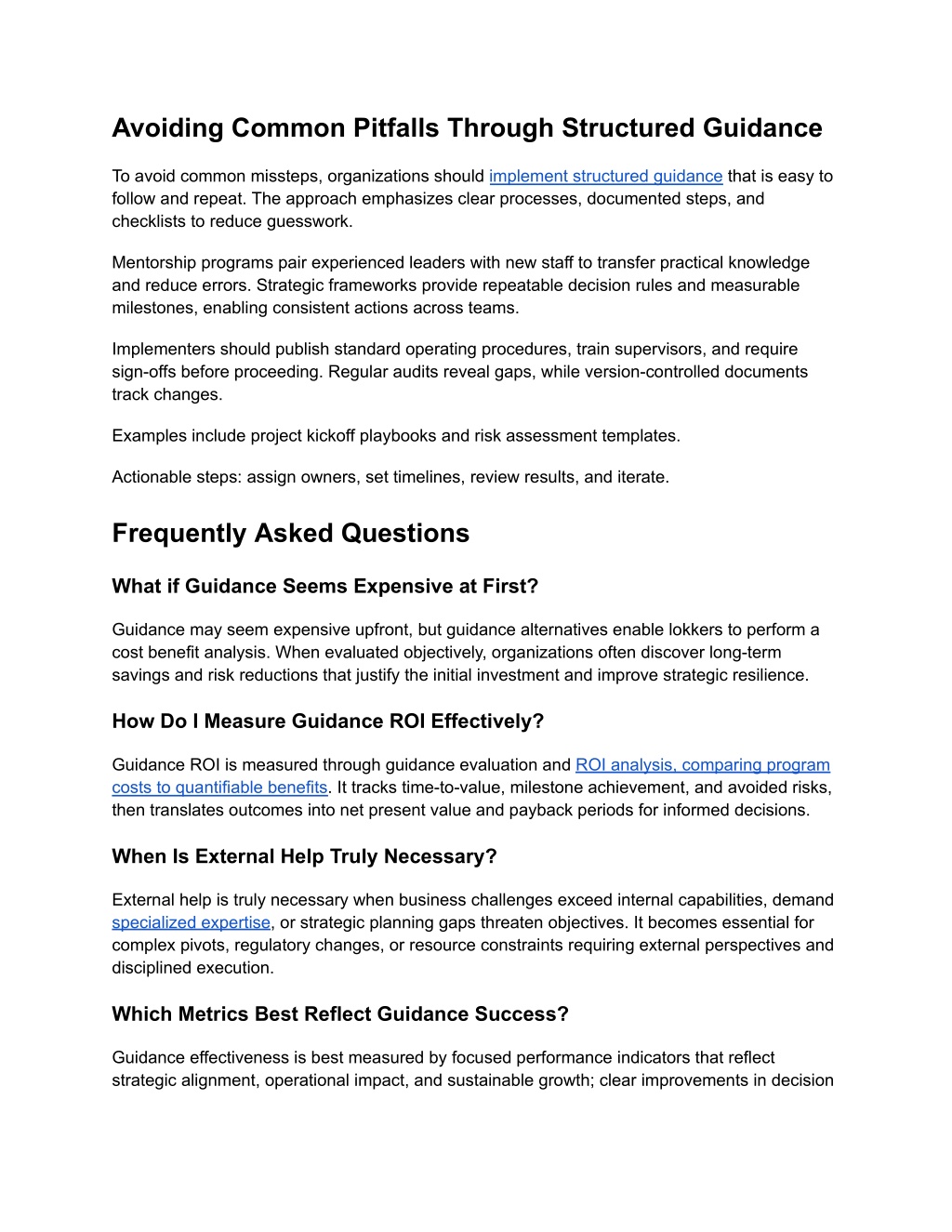 Avoiding Common Pitfalls Through Structured Guidance To avoid common missteps, organizations should implement structured guidance that is easy to follow and repeat. The approach emphasizes clear processes, documented steps, and checklists to reduce guesswork. Mentorship programs pair experienced leaders with new staff to transfer practical knowledge and reduce errors. Strategic frameworks provide repeatable decision rules and measurable milestones, enabling consistent actions across teams. Implementers should publish standard operating procedures, train supervisors, and require sign-offs before proceeding. Regular audits reveal gaps, while version-controlled documents track changes. Examples include project kickoff playbooks and risk assessment templates. Actionable steps: assign owners, set timelines, review results, and iterate. Frequently Asked Questions What if Guidance Seems Expensive at First? Guidance may seem expensive upfront, but guidance alternatives enable lokkers to perform a cost benefit analysis. When evaluated objectively, organizations often discover long-term savings and risk reductions that justify the initial investment and improve strategic resilience. How Do I Measure Guidance ROI Effectively? Guidance ROI is measured through guidance evaluation and ROI analysis, comparing program costs to quantifiable benefits. It tracks time-to-value, milestone achievement, and avoided risks, then translates outcomes into net present value and payback periods for informed decisions. When Is External Help Truly Necessary? External help is truly necessary when business challenges exceed internal capabilities, demand specialized expertise, or strategic planning gaps threaten objectives. It becomes essential for complex pivots, regulatory changes, or resource constraints requiring external perspectives and disciplined execution. Which Metrics Best Reflect Guidance Success? Guidance effectiveness is best measured by focused performance indicators that reflect strategic alignment, operational impact, and sustainable growth; clear improvements in decision