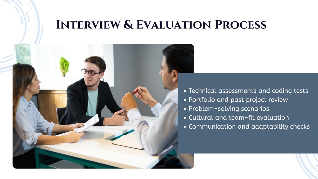 Interview & Evaluation Process Technical assessments and coding tests Portfolio and past project review Problem-solving scenarios Cultural and team-fit evaluation Communication and adaptability checks